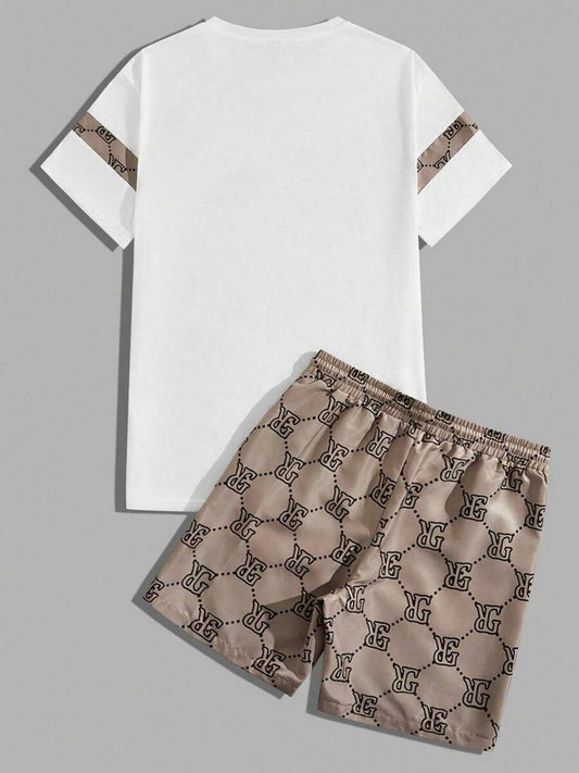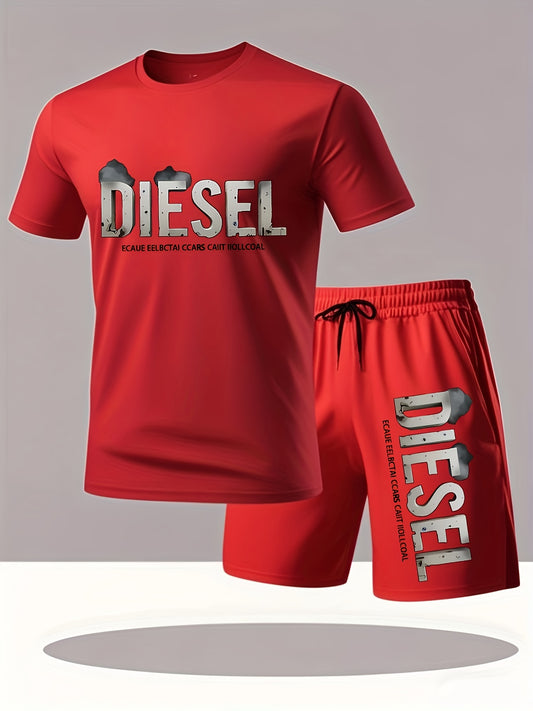 Summer Men'S Casual Sports Short Sleeve T-Shirt and Shorts Set, Comfortable Breathable, Suitable for Outdoor Jogging Running Fitness, Diesel Letter Print Design - 2pcs Set