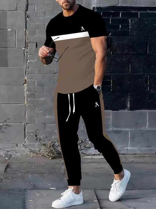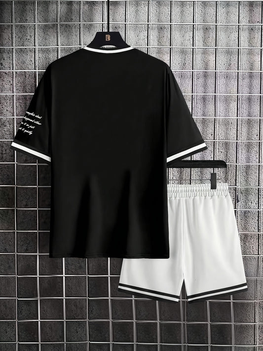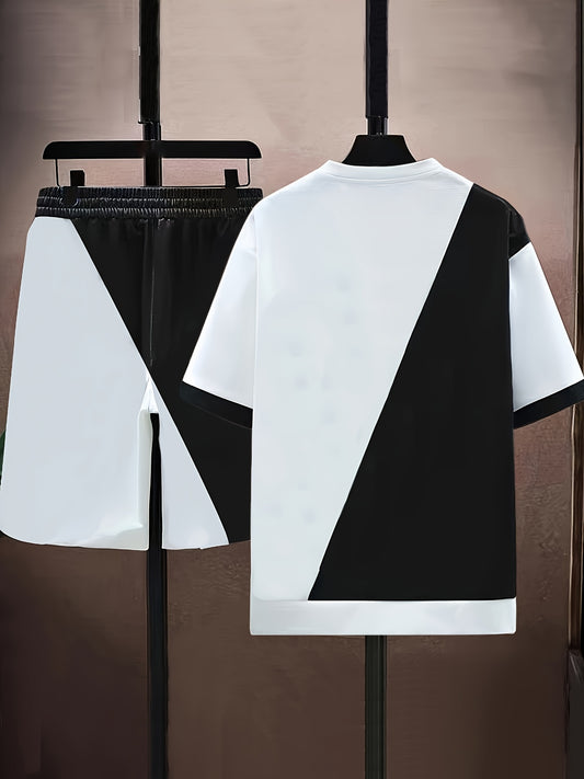 2pcs Summer Casual Sportswear Set for Men, Trendy Fashion Spliced Round Neck Short Sleeve T-Shirt and Drawstring Shorts in Black and White Color Block Design