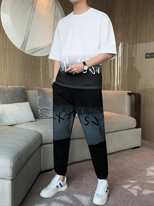 2-piece Men's Stylish Gradient Summer Outfit Set, Men's Short Sleeve Cotton Blend T-shirt & Drawstring Shorts Set