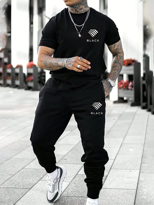 Men's casual crew-neck T-shirt, tight-legged trousers black suit, micro-elastic fabric, classic conventional