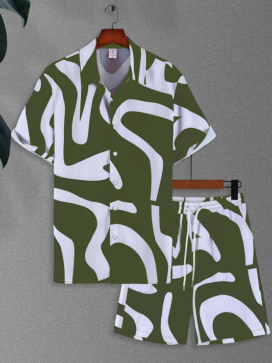 CONJUESS Men'S Summer Casual Short Sleeve Shirt and Shorts Set, Polyester 100%, Lapel Collar, Non-Stretch Woven Fabric, Irregular Striped Print, Regular Fit, 120g/m² - Green and White