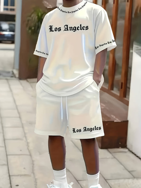 Los Angeles English Pattern Men's Short Sleeve Shirt + Casual Sport Set, Breathable Soft Summer Outfit with Pocketed Shirt and Drawstring Shorts