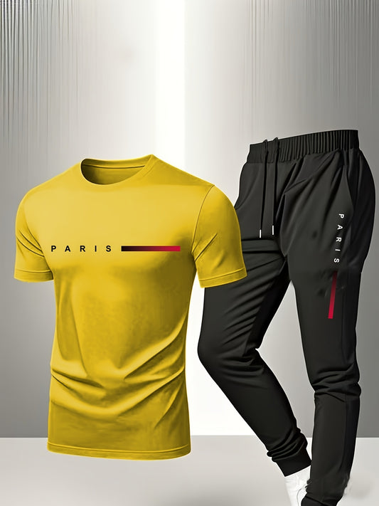 Men'S Polyester Sportswear | Elegant Casual Crew Neck | Slightly Stretchy Knit with Striped 3D Print | Regular Fit Two-Piece Set | Patterned Short Sleeve T-Shirt and Long Pants