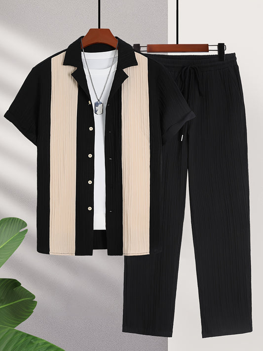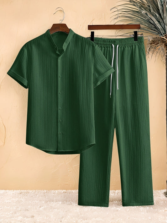 Men'S Two-Piece Set Consisting of a Casual Short-Sleeve Button-Up Shirt And Drawstring Pants, Perfect for Summer Wear.