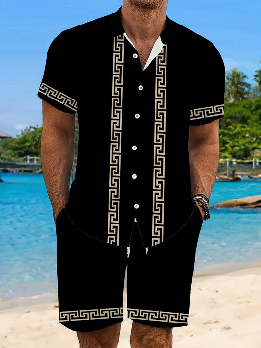 Men'S Summer Casual Short Sleeve Shirt and Shorts Set, Geometric Pattern, Square Neck, Regular Fit, 100% Polyester, Woven Fabric, 120g/m² - Black