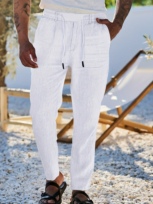 Men'S Casual Linen Drawstring Pants - Comfortable Straight Fit, Lightweight & Breathable for Beach & Outdoor Activities, Beach Casual Wear|Straight Fit Pants|Lightweight Fabric