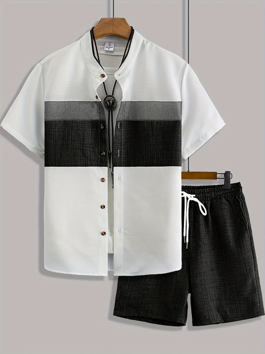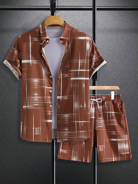 Men'S Stylish Gradient Shirt Set - Brown & White Geometric Pattern, Short Sleeve with Pocket, Loose Fit Shorts, Perfect for Beach, Camping, Fishing & Outdoor Activities, Casual Attire|Geometric Pattern Shirt|Woven Fabri