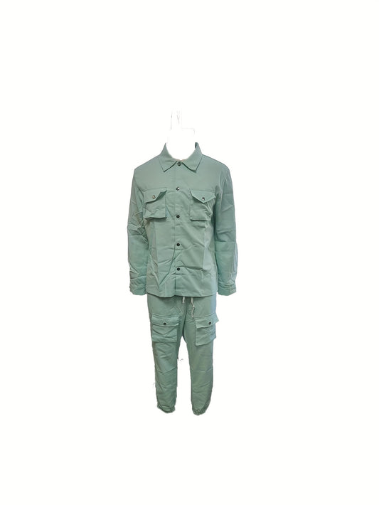 1set Men'S Casual Solid Color Polyester Outfit - Long Sleeve Button-Down Lapel Collar Jacket with Pockets and Drawstring Long Pants Set for Fall/Winter