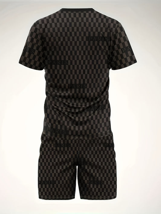 2pcs Men's Summer Casual Outfit: Ink Splash & Checkered Pattern Short Sleeve T-Shirt and Drawstring Shorts Set - Lightweight Polyester, Machine Washable, Ideal for Beach & Casual Attire