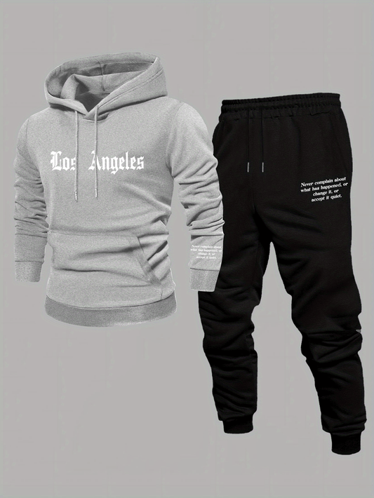 Men'S Los Angeles Print Hoodie And Sweatpants Set - Casual American Streetwear Style, Cozy Fall/Winter Activewear with Geometric Pattern, Slight Stretch Fabric, Hooded Top & Joggers, Casual Wear|Geometric Pattern Hoodiee Jogg