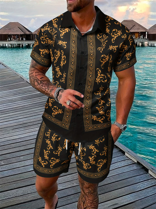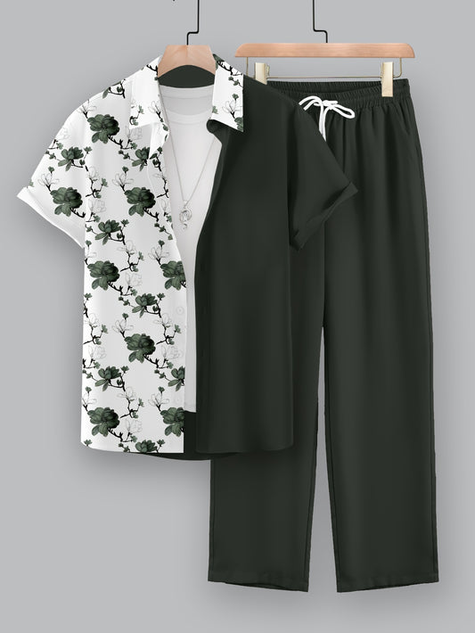Men's Casual Summer Outfit Set, Short Sleeve Shirt And Pants, Floral Print, Polyester Blend, Machine Washable