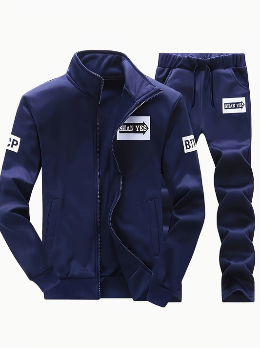 Men'S Navy Blue "Shan Yes" Print Casual Sports Suit - Zip-Up Hoodie & Joggers with Pockets, Regular Fit for Spring & Fall, Comfortable Leisure Wear, Leisure Wear Hoodie | Sporty Hoodie | Zipper Closure, Essential Hoodie