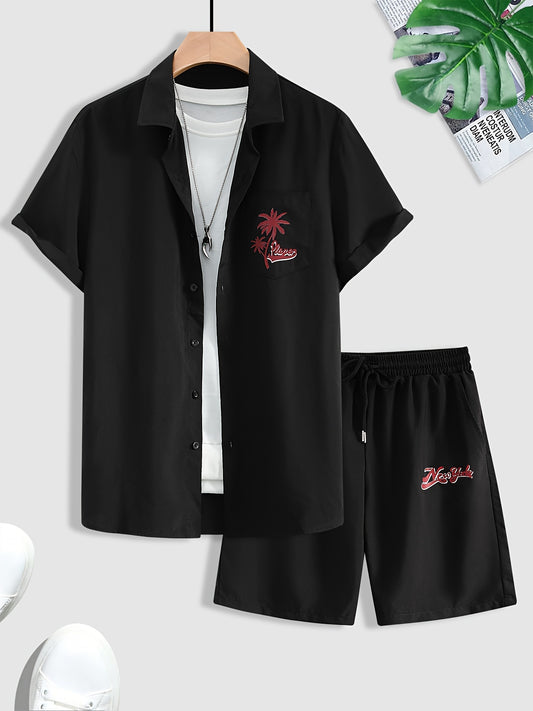 2-piece Men's Stylish Summer Beach Wear Set, Letter Print Men's Short Sleeve Lapel Shirt With Chest Pocket & Drawstring Shorts Co Ord Se