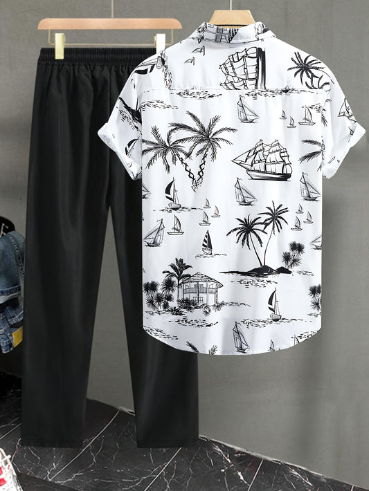 Men's Casual 2-Piece Set, Random Print Short Sleeve Shirt And Drawstring Pants, Regular Fit, Casual Beach Vacation Outfit