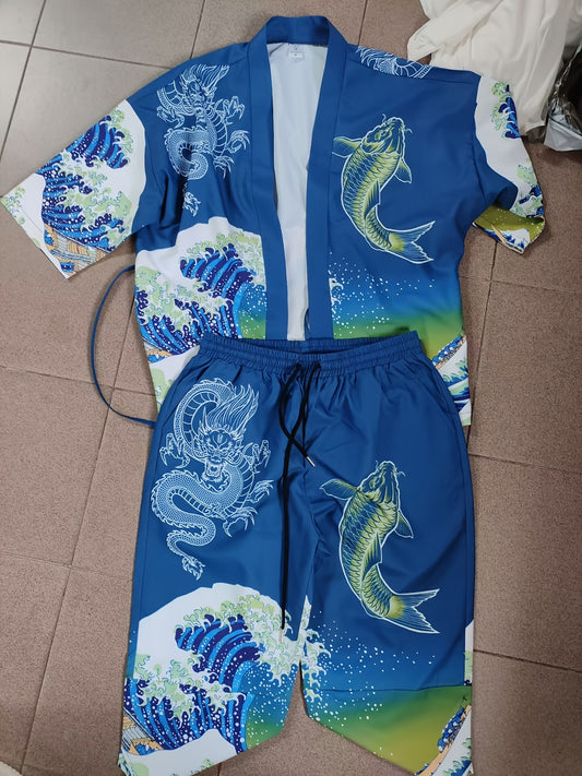 Men's Kimono Set with Carp Leaping Over the Dragon Gate Pattern
