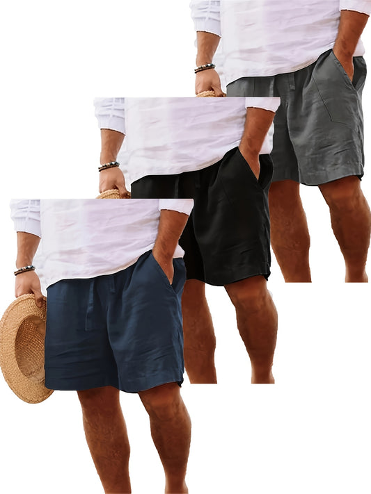 Men's Summer Cotton Drawstring Elastic Waist Straight-Leg Solid Color Breathable Casual Beach Shorts - 3pcs