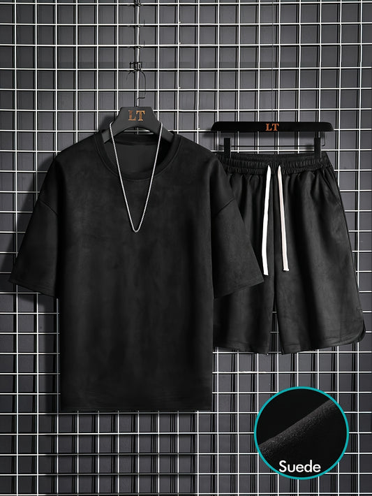 Two-piece Men's summer short-sleeve set, round-neck T-shirt, high-end solid color, half-sleeve, open-back hair clip, thin-fit shorts