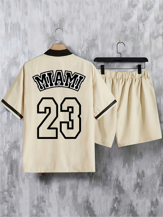 Men's Chicago Letter Print Casual Short Sleeve Baseball Shirt with Printed Webbing + Drawstring Shorts Two-Piece Set