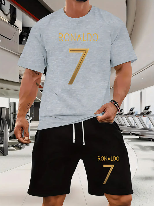 Ronaldo 7 Print Men'S Short Sleeve T-Shirt and Waistband Shorts 2pcs Casual Sports Regular Top & Bottom Set, Suitable for Spring/Summer
