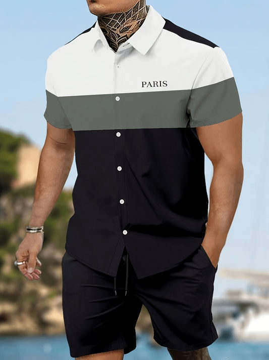 Men'S Letter Color Block Short Sleeve Shirt Shorts Casual Suit 2pcs Set