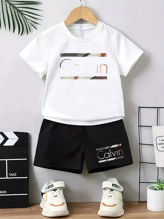 2pcs - Youngsters' Short Sleeve Shorts Set - Street Style Casual "Calvin" Letter Print, Vibrant Design - Summer Outdoor Outfit, Polyester Fabric, Comfortable for All Seasons, Daily Wear | Lively Printed Top | Stretchy Materia