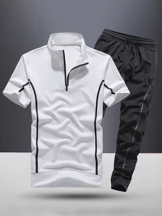 Men's Fashion Stripe Casual Suit, 2pcs Stylish Stand Collar Zippered Breathable Outfit with Short Sleeve T-Shirt and Drawstring Pants for Summer Wear