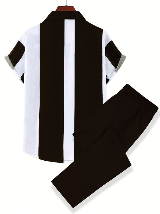 Men'S Casual Summer Short Sleeve Shirt & Pants Set - Black with White Geometric Print, Button-Up Collared Shirt & Loose Fit Pants, Non-Stretch Fabric, Perfect for Spring/Fall, Spring Summer Outfit | Geometric Print Shirt | Bu