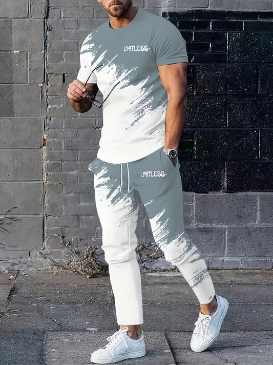 Men's Fashion Gradient Print Four Seasons Round Neck Short Sleeve T-shirt and Pants Set Outdoor Sports Two-piece