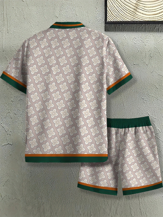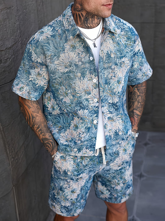 Men'S Summer Casual Short Sleeve Shirt & Shorts Set - Tropical Print, Loose Fit, Button-Up with Collar, Lightweight Polyester Fabric for Outdoor & Leisure Activities, Summer Casual Wear | Tropical Print Shirt | Lightweight Fa