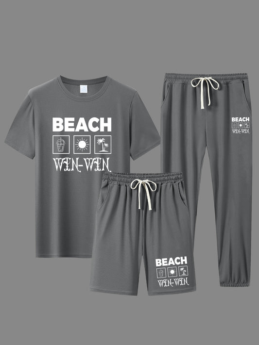 BEACH Men's 3-Piece Casual Sportswear Set, Crew Neck Short Sleeve T-Shirt with Shorts and Long Pants, Versatile Simple Breathable Summer Outfits, Knit Fabric Regular Fit, 100% Polyester Material, Casual Style Lash Sets, Sligh