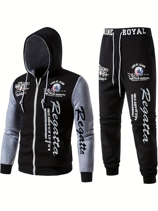 Men's Hooded Letter Print Tracksuit, 2pcs Casual Sports Set, Fashion Hoodie With Full-zip And Elastic-waist Pants, Regular Fit, Outdoor Cloth
