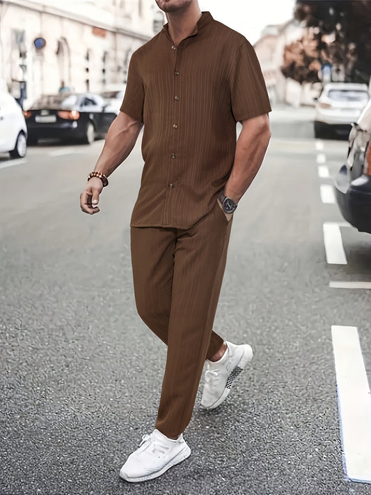 Men's New Trendy Textured Wave Stripe Short Sleeve Long Pants Casual Suit