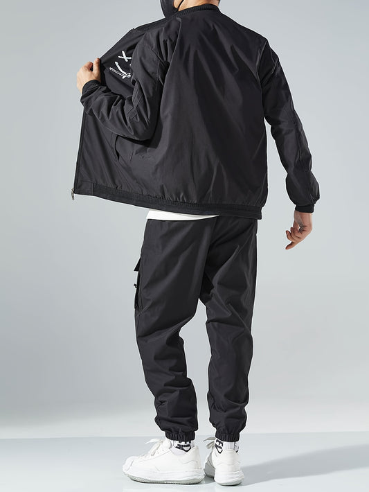 Men's Casual 2-Piece Outfit, Stylish Color Block Zip Up Hooded Jacket, Breathable Solid Color Drawstring Pants
