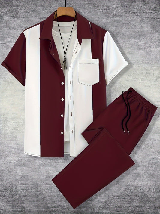 Men'S Casual Two-Piece Spring/Summer Color Block Short Sleeve Shirt and Pants Set - Polyester, Regular Fit, Button-Up with Pocket, No Belt, All-Season Wear, Casual Attire|Casual Style|Polyester Fabric