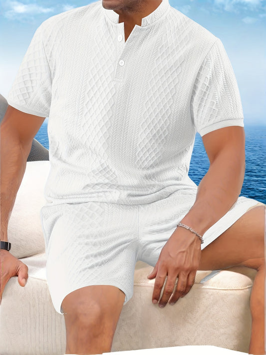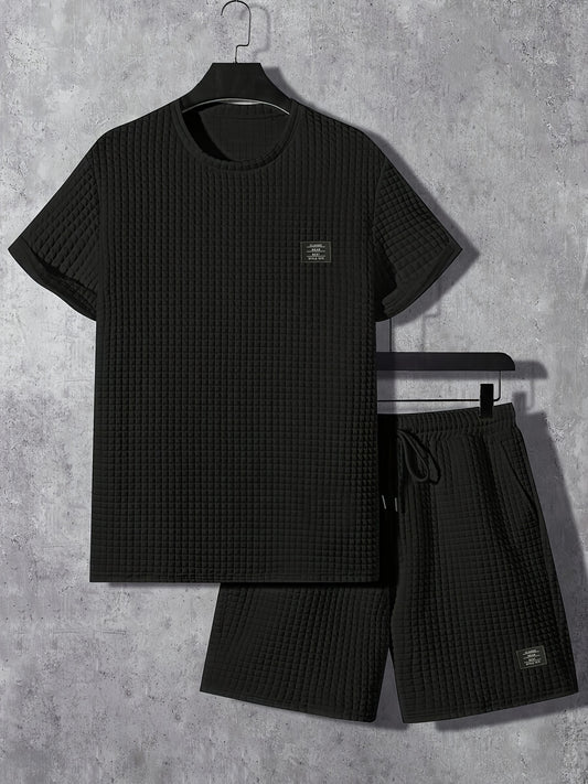 Two-Piece Set, Men'S Summer Outfit, Jacquard Set, Round Neck Short Sleeve, Drawstring Shorts, High Weight Fabric, Casual Ensemble.