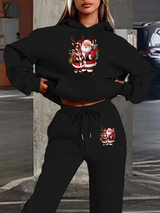 Women's winter clothing Santa Claus printed Women's velvet hooded sweater set