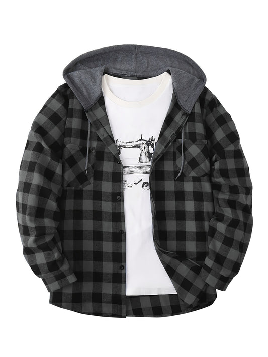 Plaid Shirt Coat For Men Long Sleeve Casual Regular Fit Button Up Hooded Shirts Jacket