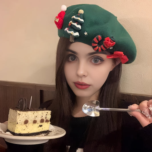 Women's Red Christmas Beret Hat with 3D Christmas Tree Decorations - Elastic Drawstring Closure, Lightweight Warm Winter Hat for Holiday Parties, Photo Shoots, Valentine's & New Year's Eve - Festive Movie-Inspired Fashion Acc