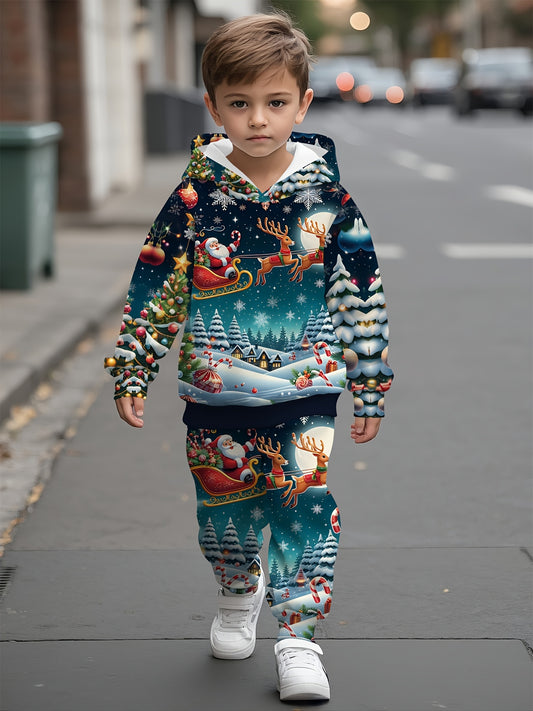 2pcs Boys' Christmas & New Year 2-in-1 Hoodie Set with Santa & Reindeer 3D Print - Warm Winter Outfit, Matching Sweater & Pants for Kids, Holiday Party (Hand Washable) - Festive Boys Clothing, Perfect for Outdoor