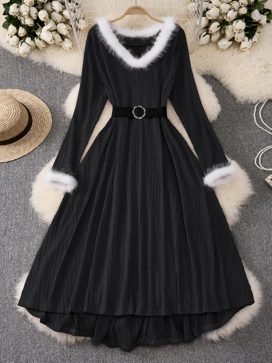 Autumn Winter Fashion Velvet Silvery Star Twist Knot Long Sleeve Vacation Elegant v-neck Dress, Elegant Evening Wear, Festive Occasion Wear, Stylish Knot Detail, Premium Material, Highquality Stitching, Kneelength Dress, Body