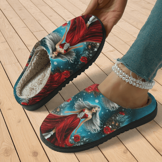 Women's Red Slippers with Red Dress Print - Winter Warm Soft Sole Slip-On Moccasins Suitable for Winter Parties, Christmas & New Year's Eve - Comfortable /Outdoor Footwear, European Style Fabric Upper & TPR Sole