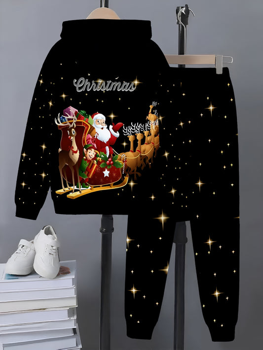 2pcs Girls' Santa Claus Face & 3D Print Hooded Sweatshirt & Pants Set - Red & Golden Christmas Outfit with Santa Hat & Reindeer Design, Casual Winter Clothes for Toddlers & Kids, Perfect Gift for Little Boys & Girls (Machine