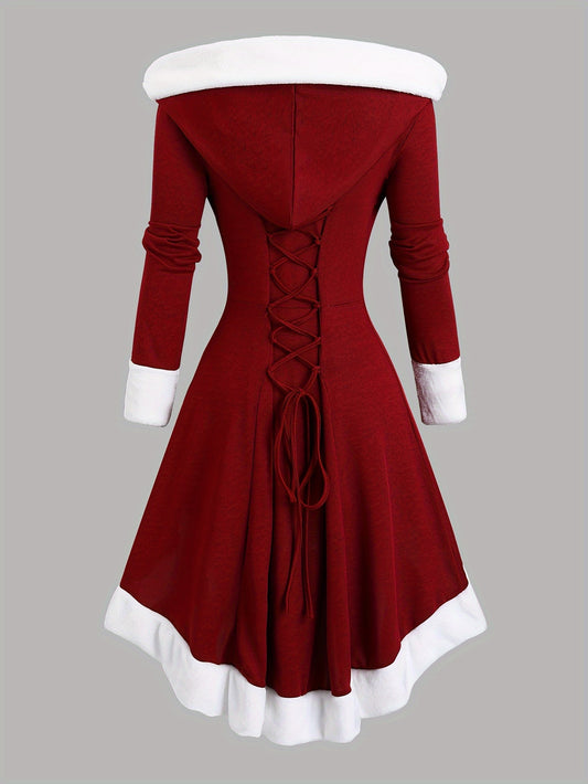 Women'S Vintage Christmas Party Dress - Long Formal gown with Hood, A-Line Silhouette, Drawstring Hood - Burgundy & White Holiday Outfit for Xmas, New Year'S Eve - Elegant Winter Evening Attire, Seasonal Celebration, Classic