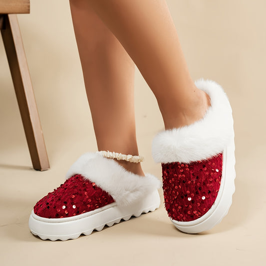 Women'S Winter Plush Slip-On Slippers with Golden Snowflake & Red Tree Print - Soft Warm Indoor House Shoes with Plush Lining, Cozy Winter Footwear for Christmas, Holiday Gifts, Christmas Slippers, Festive Footwear, Seasonal