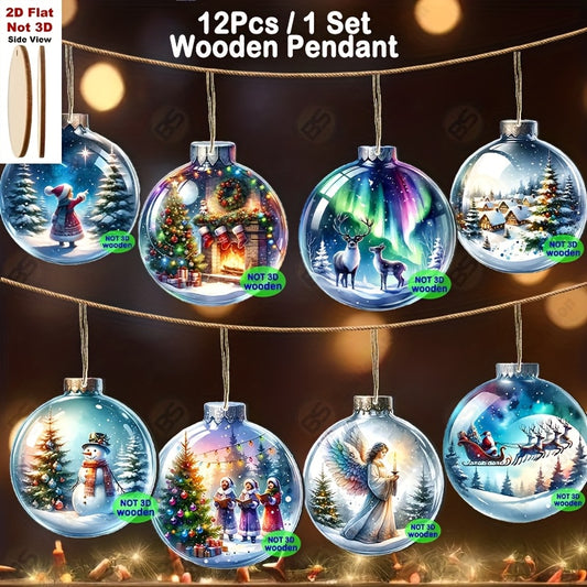 2D Flat, 12pcs Set Christmas Ball Wooden Decorations - Perfect for Christmas Tree New Year Decorations, Home and Window Decoration | Ideal Holiday Party Accessories, And Gifts, Christmas Decorations, Christmas Tree Decoration
