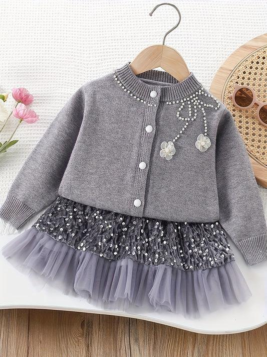 2pcs Girls' Elegant Sequin Trim Sweater & Sparkle Tulle Tutu Skirt Set - Red & Golden Glittery Party Outfit with Ruffled Hem, Long Sleeve Round Neck Top & Layered Tulle, Perfect For Halloween, Christmas, Photo Shoots, Pageant