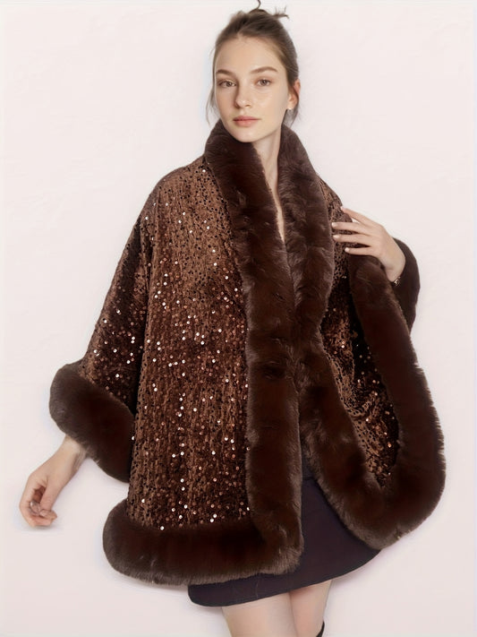 Plus Size, Women's Elegant Shawl Cloak Poncho - Luxury Brown Cape with Sparkling Glamour, Thick Winter Coat for Parties, Formal Events - Non-Stretch Fabric, Easy Care Elegant Wrap for Everyday Special Occasions, Party Wear, C