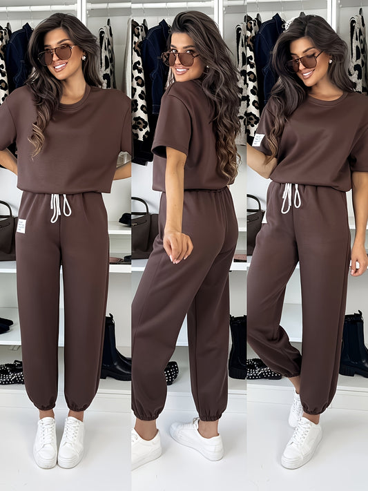 Elegant Patchwork Women'S Fashion Suit - Short Sleeve, Crew Neck, Polyester, Spring/Summer Collection, Casual Attire|Modern Casualwear|Polyester Fabric