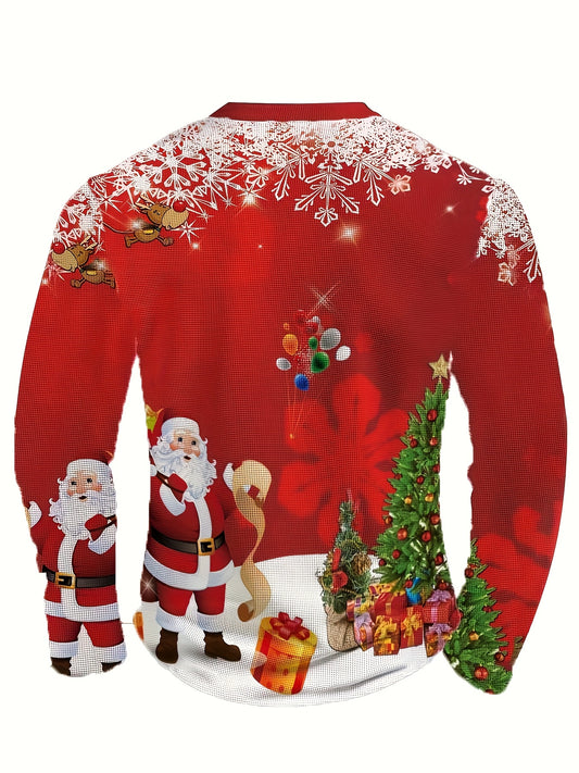 Men'S Red & Waffle Christmas Sweater with Santa Claus & Snowflake Print - Long Sleeve V-Neck Button-Front Casual Holiday Party Shirt, Christmas Sweater, Seasonal Clothing, Comfortable Fit, Festive Clothing, Warm Material