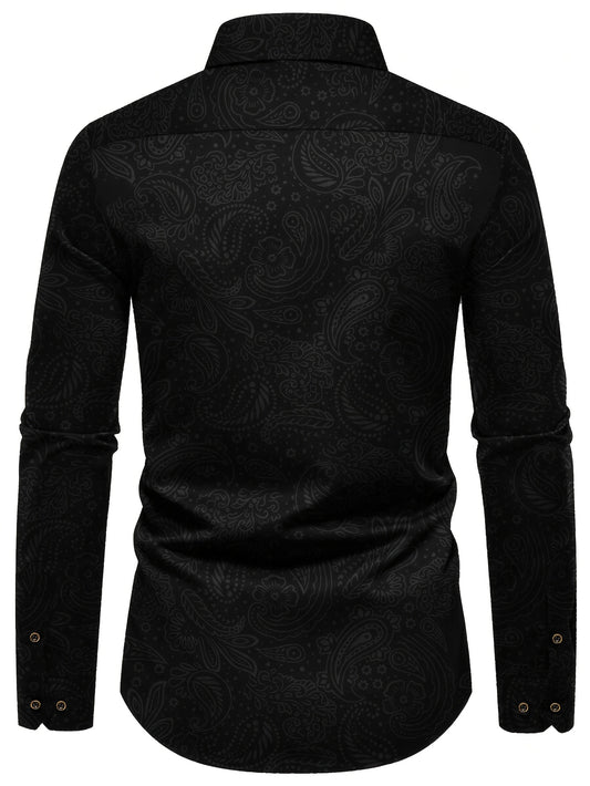 Men's Slim-Fit Black Paisley Print Long Sleeve Shirt - Stylish Button-Up with Unique Irregular Dark Pattern, Polyester, Machine Washable, All-Season Wear